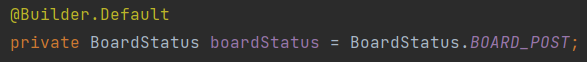 코드에서 볼 수 있듯이 게시글 상태를 지정하는 변수인 boardStatus에 @Builder.Default 애노테이션이 붙은 것을 보실 수 있습니다. 이 상태에서 BoardStatus.BOARD_POST(게시글 등록 상태)를 지정해주면 게시글 엔티티는 빌더로 생성할 때 boardStatus를 지정하지 않아도 게시글 등록 상태가 기본적으로 적용됩니다.