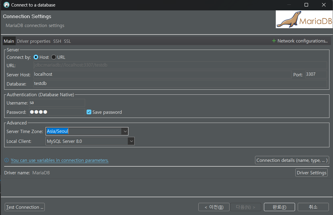 Server Time Zone도 Asia/Seoul로 설정하였고 설정이 완료되었다면 좌측 하단의 [Test Connection]을 클릭하여 연결에 대한 테스트를 진행해봅니다.