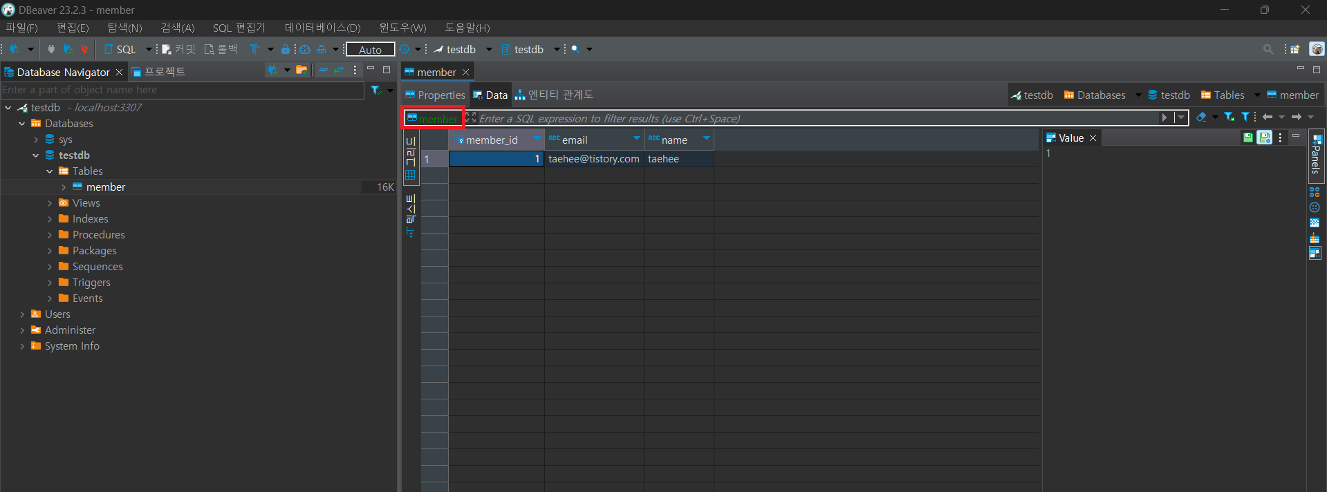 연결이 완료된 후 확인해보면 MariaDB 데이터베이스에 연결되었고 이전에 주입했던 데이터를 확인할 수 있음을 확인할 수 있습니다.