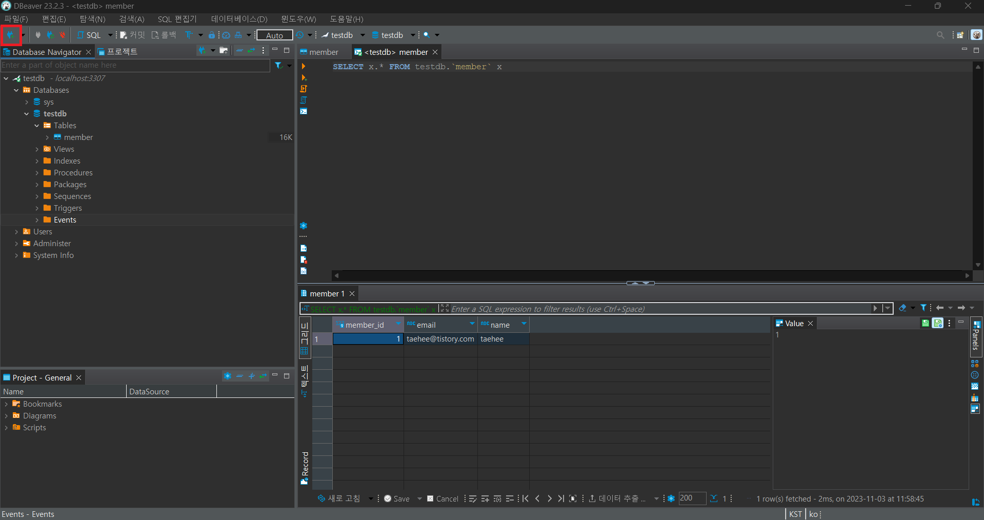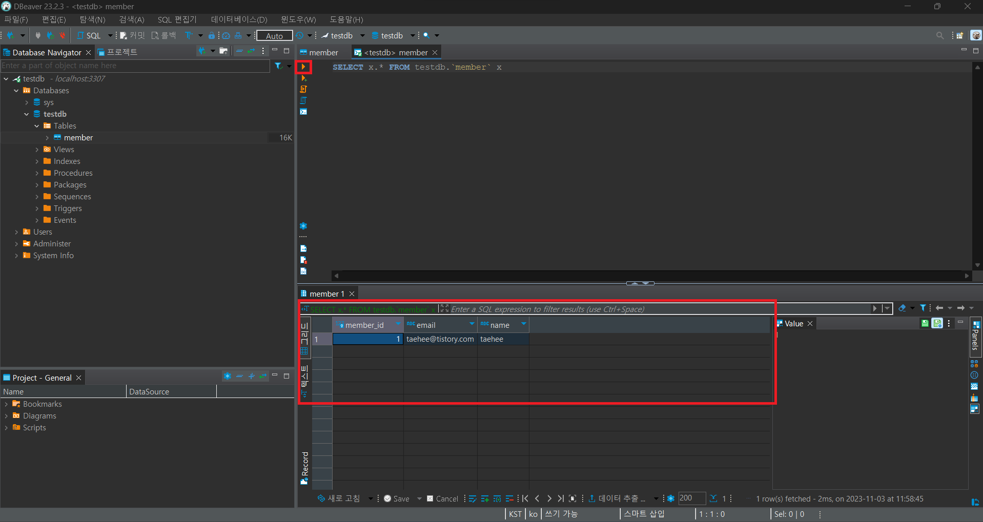 만약 쿼리문을 실행하고 싶다면 빨간 네모칸 부분을 더블 클릭하시면 됩니다.