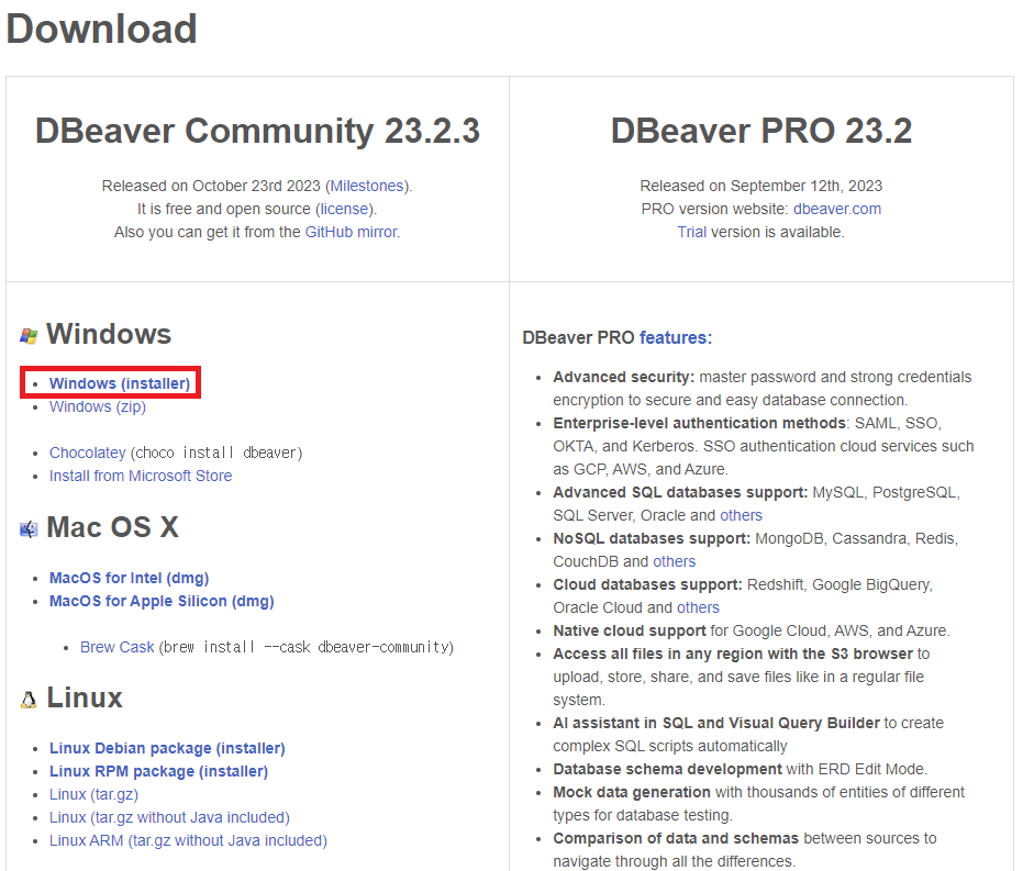 https://dbeaver.io/ 에 접속하여 Community Edition을 자신의 OS 설정에 맞게 설치합니다.