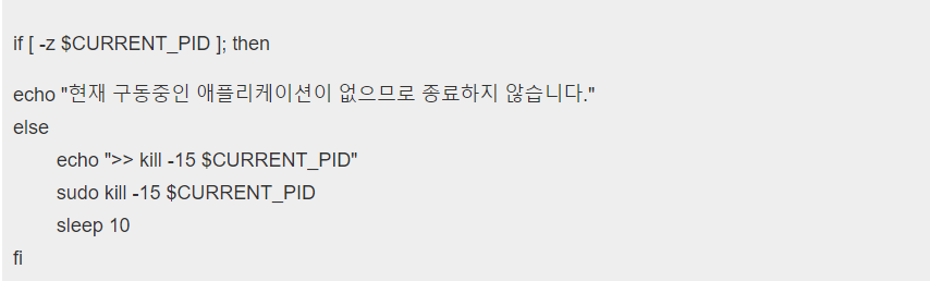 위 코드는 만약 우리가 앞서 빌드 후 실행한 jar 파일의 Process ID가 존재한다면 종료시키는 명령어입니다.