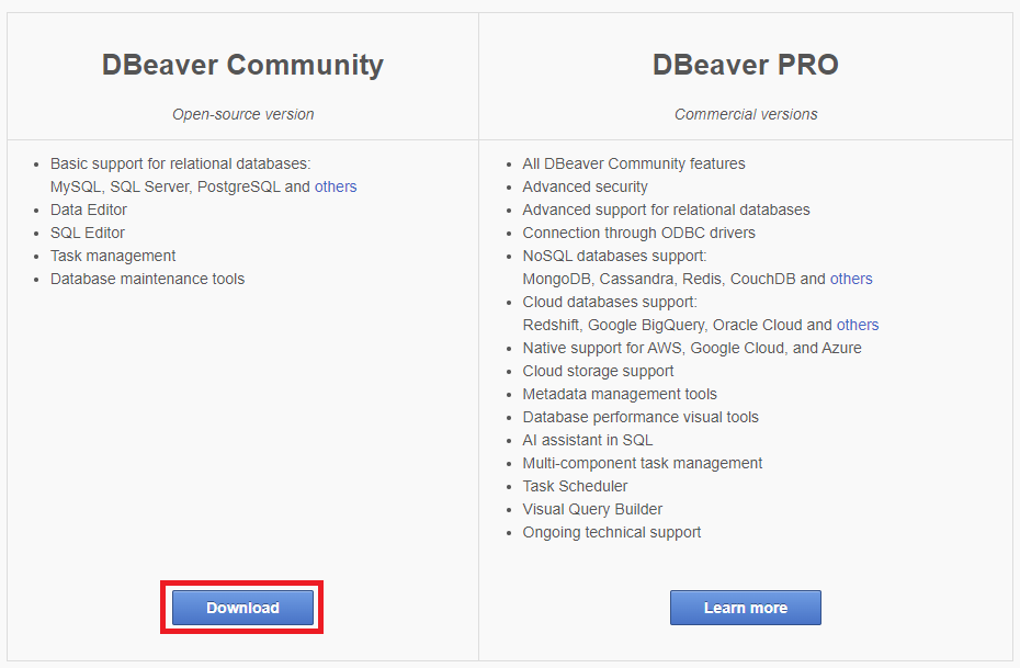 https://dbeaver.io/ 에 접속하여 Community Edition을 자신의 OS 설정에 맞게 설치합니다.