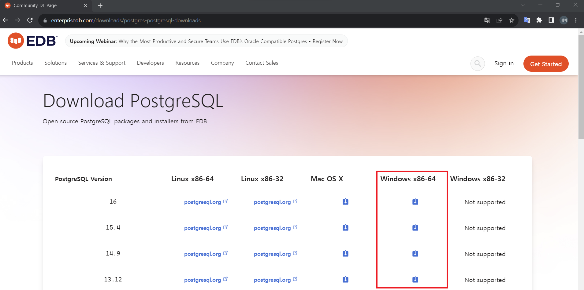 2. Windows x86-64에서 원하는 PostgreSQL Version을 선택하여 설치 버튼을 클릭합니다.