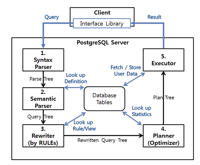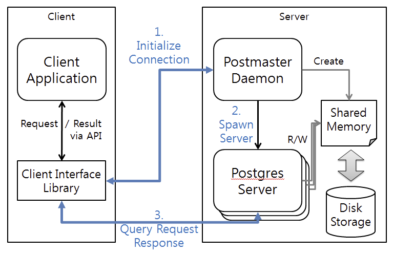 클라이언트는 (1)인터페이스 라이브러리(libpg, JDBC, ODBC 등의 다양한 인터페이스)를 통해 서버와의 연결을 요청하면, (2)Postmaster 프로세스가 서버와의 연결을 중계합니다. 이후 (3)클라이언트는 할당된 서버와의 연결을 통해 질의를 수행합니다. Shared Memory를 이용하여 GC와 같은 작업을 통해 MVCC를 관리합니다.