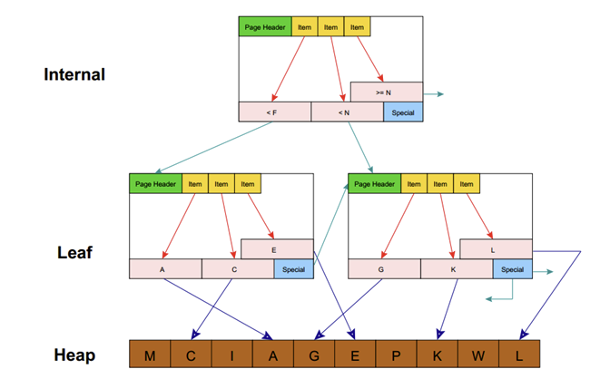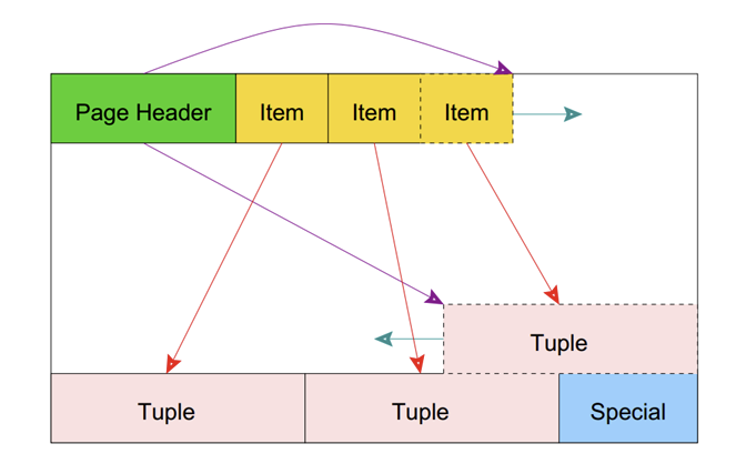 데이터가 저장되는 파일들은 여러개의 페이지들로 구성되며, 하나의 페이지는 확장 가능한 slotted page 구조를 가집니다.