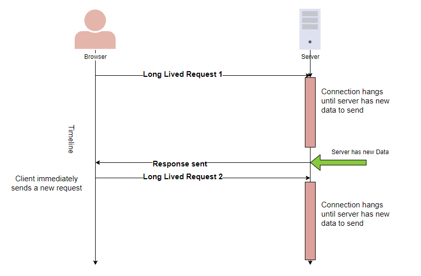 Long Polling 방식은 클라이언트가 서버에 HTTP Request를 요청하면 서버는 대기하고 있다가 이벤트가 발생 시 응답을하고 클라이언트는 응답을 받자마자 다시 서버에 Request를 요청보내 실시간성을 살리는 방식입니다.