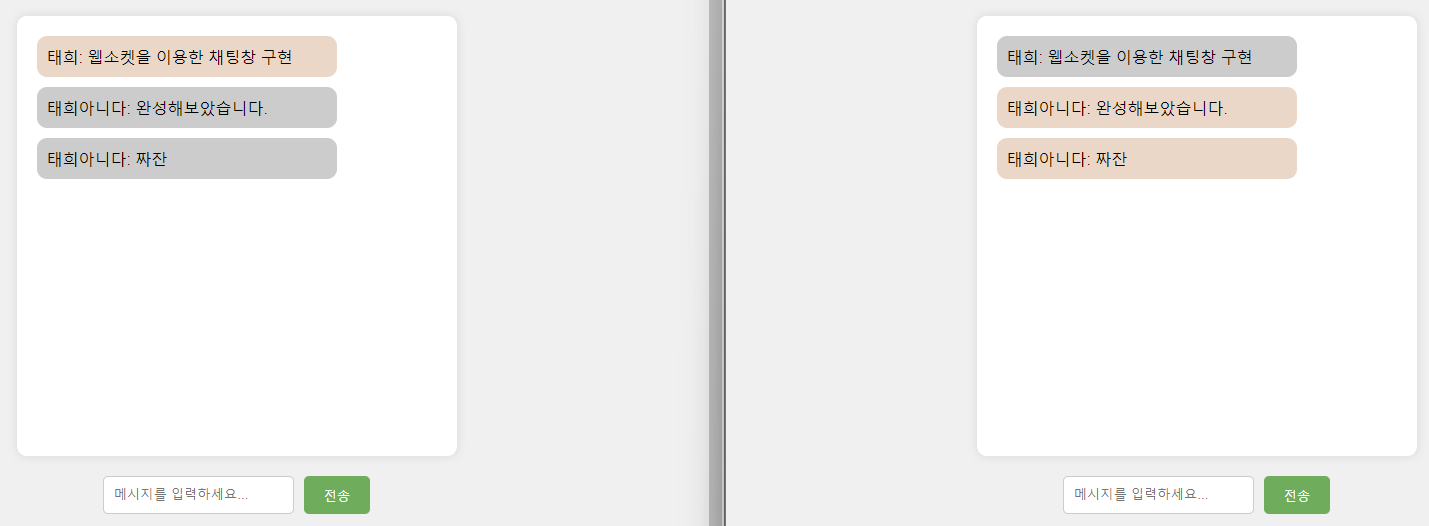 앞선 작업들을 통해 다음과 같이 채팅창 기능이 구현되었습니다.