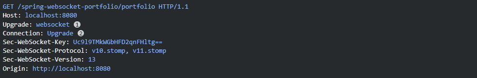 WebSocket 상호 작용은 HTTP Upgrade 헤더를 사용하여 업그레이드하거나 WebSocket 프로토콜로 전환하는 HTTP 요청으로 시작합니다. 다음 예에서는 이러한 상호 작용을 보여줍니다.