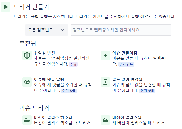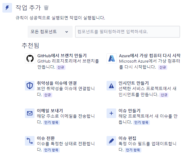 그 이외에 자동화 템플릿이 많은 것을 보아 Jira를 적극적으로 활용하면 정말 편하고 좋은 자동화 툴이 될 것이라 생각됩니다.