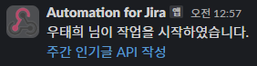 아래와 같이 이슈를 작업 중으로 옮겼을 때 Slack 메시지를 받을 수 있었습니다.