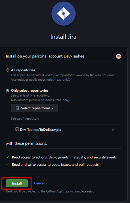 연습용으로 사용하기 위한 repository를 선택한 후, [Install]을 눌러줍니다.