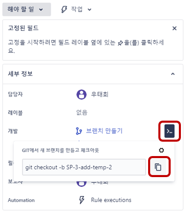 그런 경우에는 [브랜치 만들기]의 2번째 버튼을 클릭하여 제공해주는 명령어를 복사하여 사용하시면 됩니다.