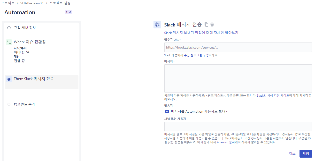 앞서 작성했던 글의 내용에서 설명드렸듯 Jira와 Slack 연동한 이유는 팀원들의 작업 상태 변화를 빠르게 파악하기 위함이었습니다. 관련 작업을 진행해보도록 하겠습니다.