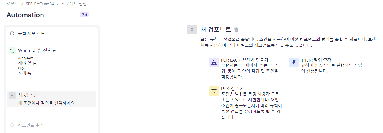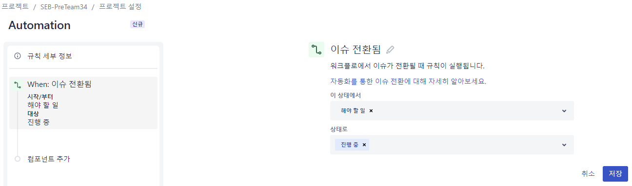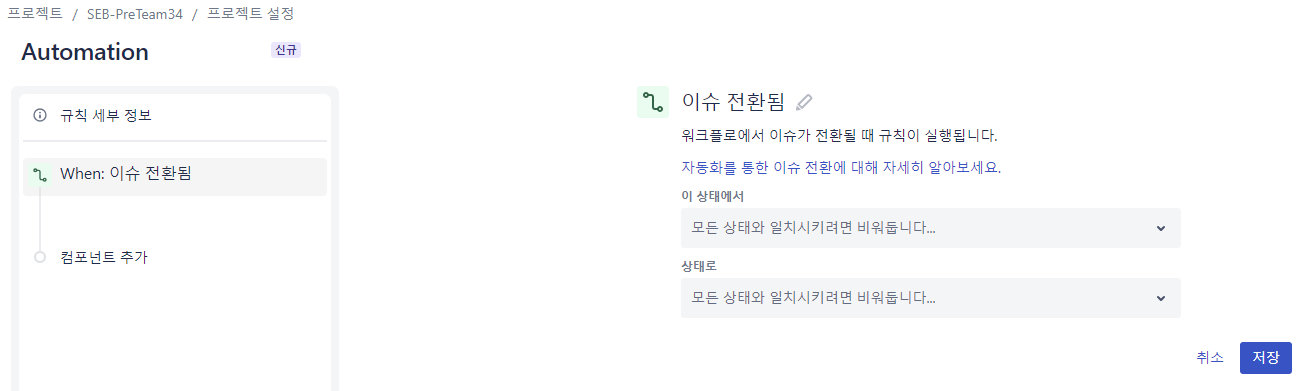 이 중 과거 과제에서의 목적이 팀원의 작업 상태 변화를 파악하는 것이 목적이었기에 "이슈 전환됨" 항목을 선택하겠습니다.