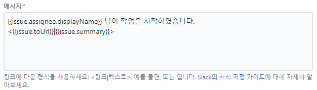 앞서 설명드리지 않은 {{issue.toUrl}}을 통해 <링크|텍스트> 양식을 만들어 업무 내용에 링크도 포함시키도록 하였습니다.