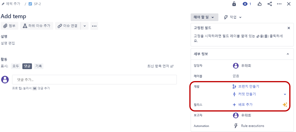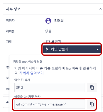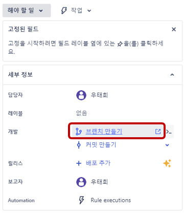 연결이 완료된 후, 이슈를 생성해보면 그 동안 못보던 개발 탭에 [브랜치 만들기], [커밋 만들기]가 생긴 것을 확인하실 수 있습니다.