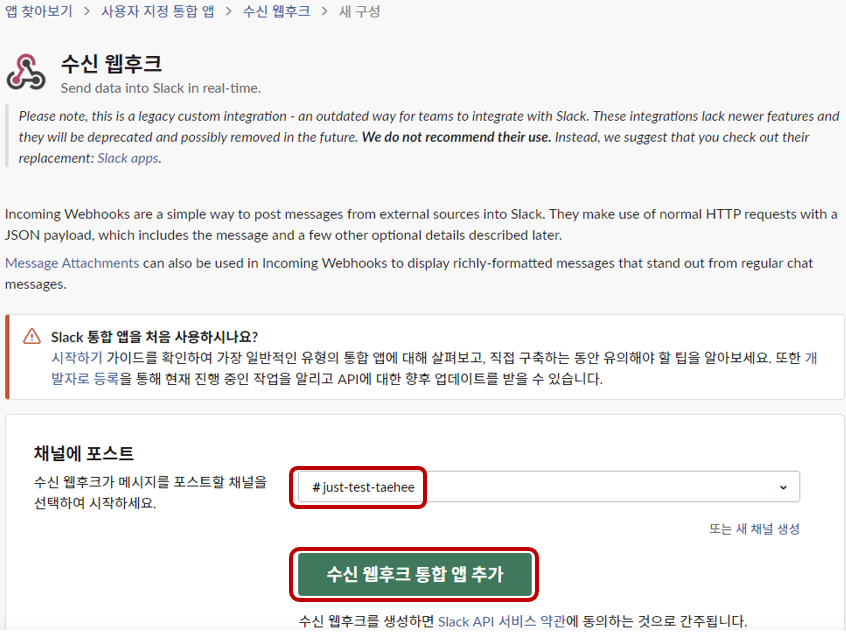 웹후크 URL은 Slack 채팅방의 주소라고 생각하시면 됩니다.